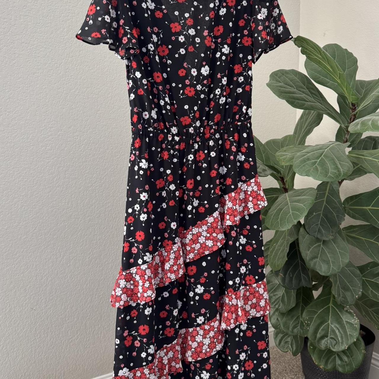 Black and red floral midi dress with ruffle details from Michael Kors❤️! I loved this dress I just outgrew the style. The front does have a clip but it’s a little loose. #floraldress #MichaelKors #Maxidress