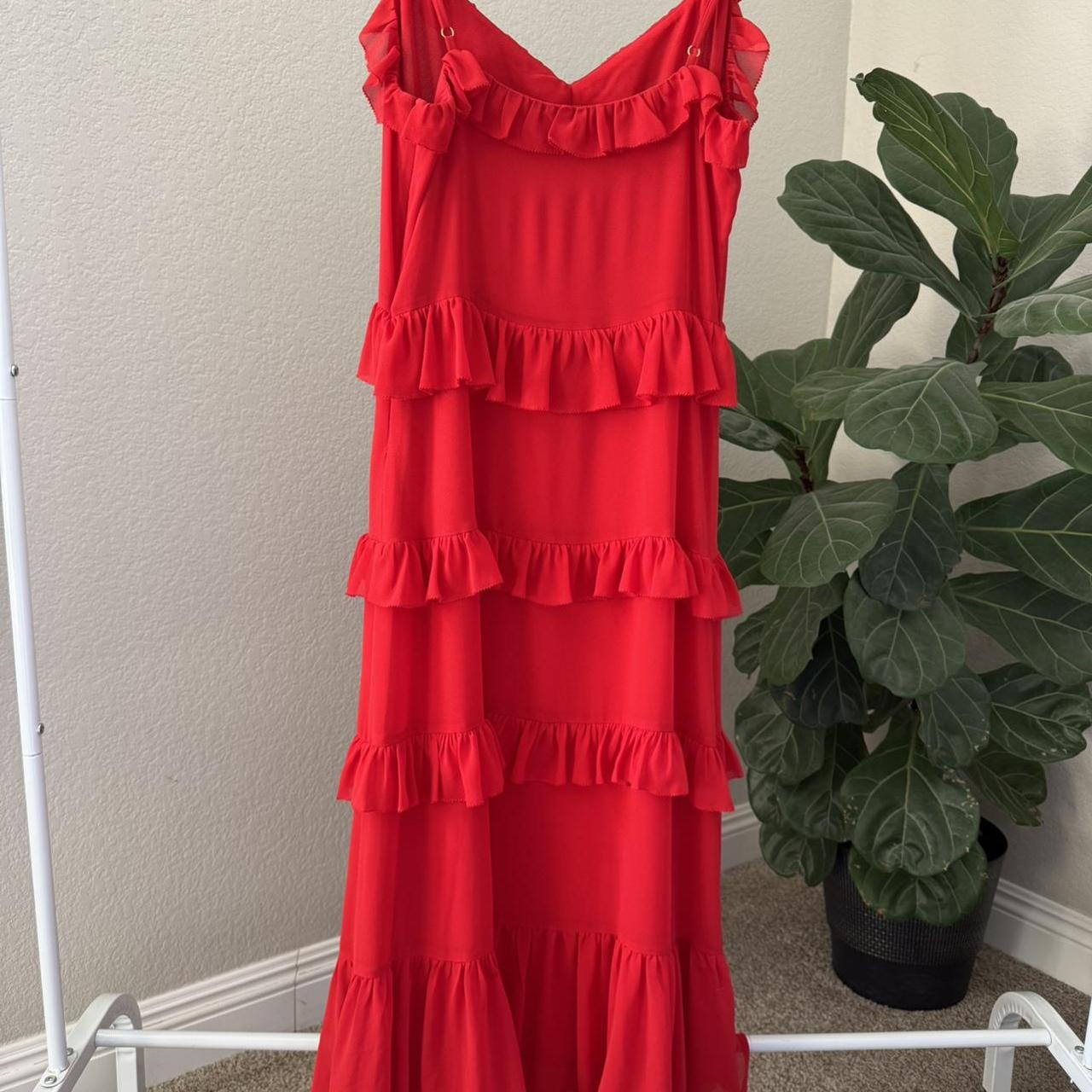 Red tiered maxi dress with adjustable straps and ruffled layers from Michael Kors! It’s so cute and comfortable with some black or nude heels 👠. Definitely recommend and I only wore it a few times. #maxidress #redhot #MichaelKors #JetSetGo